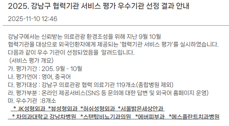 2025 강남 의료관광 서비스평가 우수기관 선정
