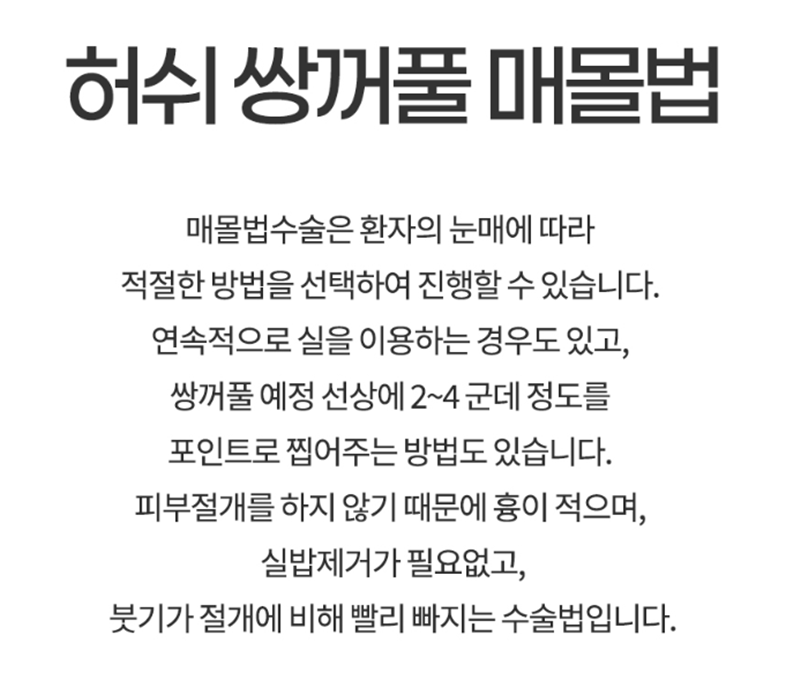 즉, 매몰법은 흉터가 거의 없고 회복이 빠른 것이 장점이에요.
