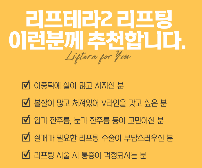 리프테라2는 절개나 회복 부담이 큰 수술적 리프팅이 아닌 비침슴적 방식으로 피부 탄력과 윤곽을 개선하는 방법입니다.