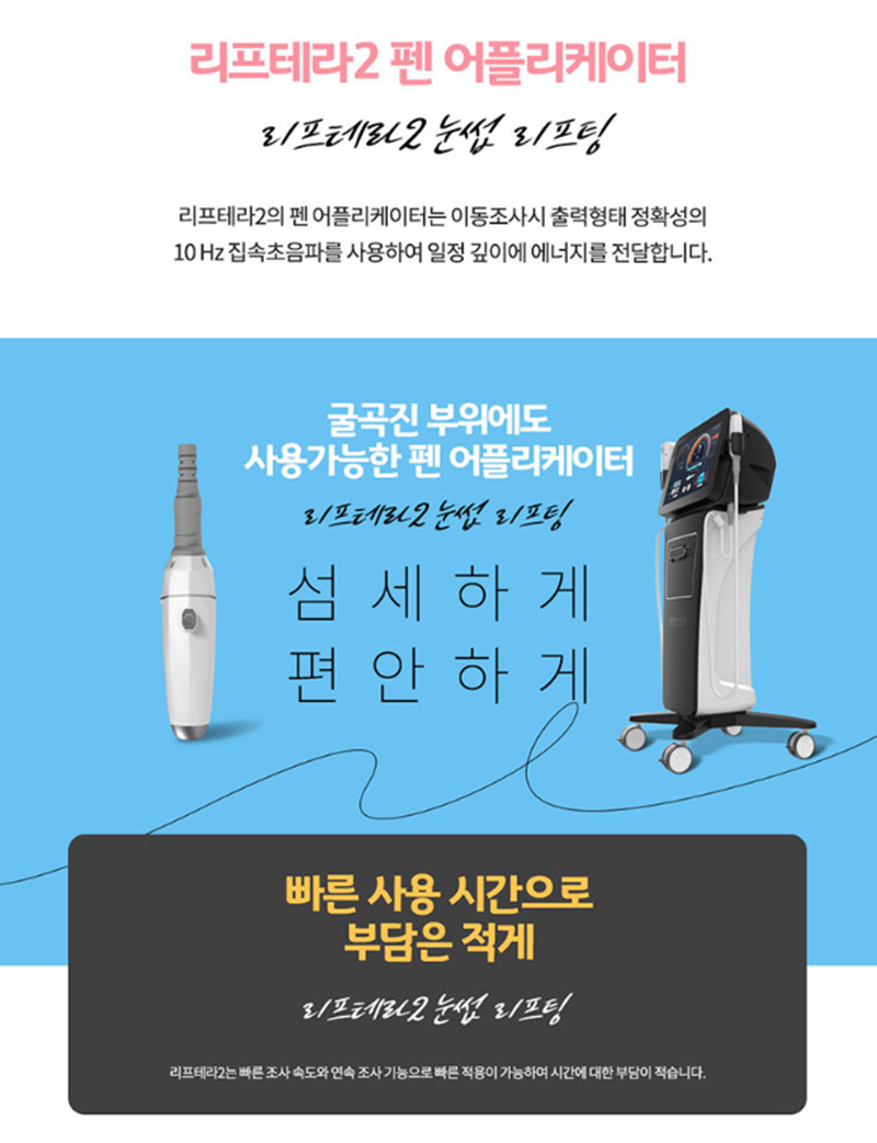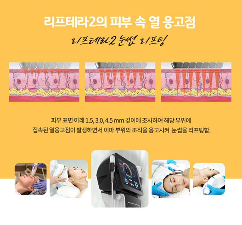 리프테라2는 초음파 리프팅 기기로, 피부 깊숙한 층(SMAS층)에 에너지를 전달해 탄력을 개선하고 처진 피부를 당겨주는 시술입니다.