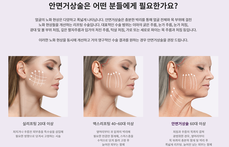 그래서 단독 리프팅 시술로 사용되기보다는 안면거상술 과정에서 처진 조직을 정리한 뒤 위치를 보다 안정적으로 유지하기 위한