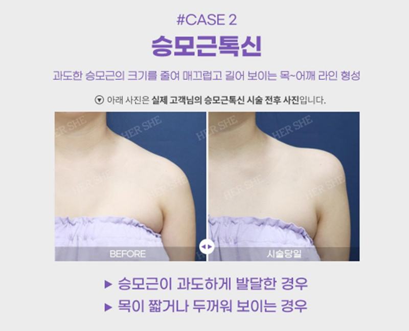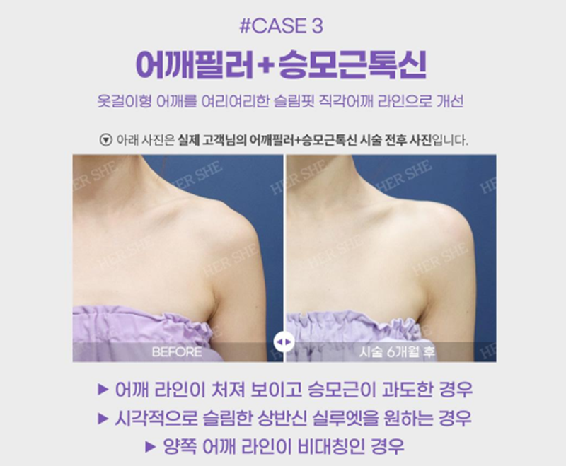 어깨가 좁아 보이는 경우, 직각어깨 라인을 원하는 경우 고려될 수 있으며 두 시술을 함께 고려하면