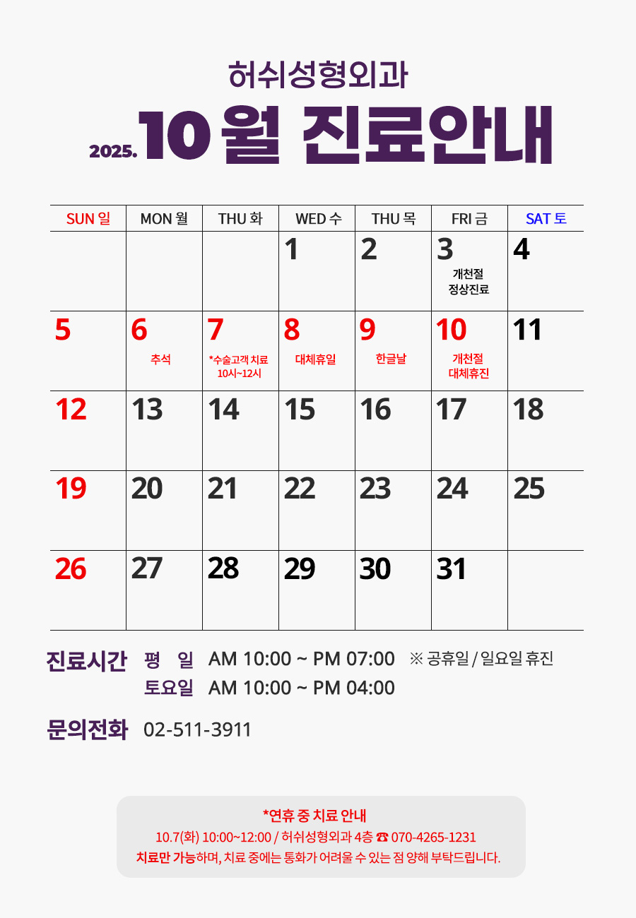 [허쉬성형외과] 2025년 10월 진료일 안내