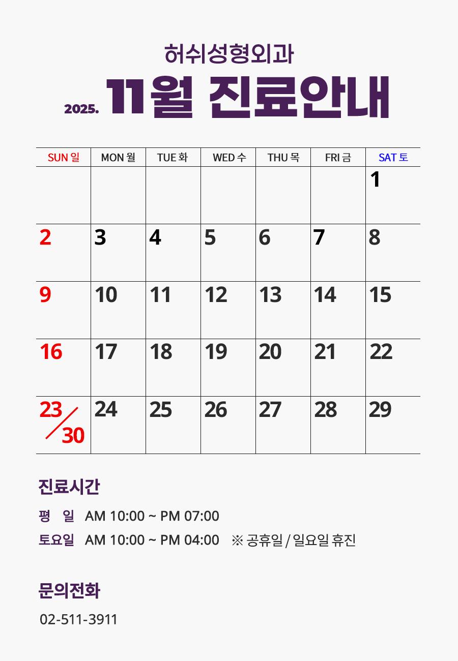 [허쉬성형외과] 2025년 11월 진료일 안내
